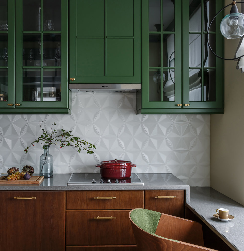 Очень красивый кухонный гарнитур, в котором дизайнер сочетала зеленую эмаль и рыжий шпон, сделали на заказ. «Десять лет назад никто его не хотел, а сейчас он неожиданно стал модным, — рассказывает Надя Зотова. — Он хорошо смотрится в сочетании с латунью и холодными серыми и зелеными оттенками. Выглядит ярко, но благородно».
