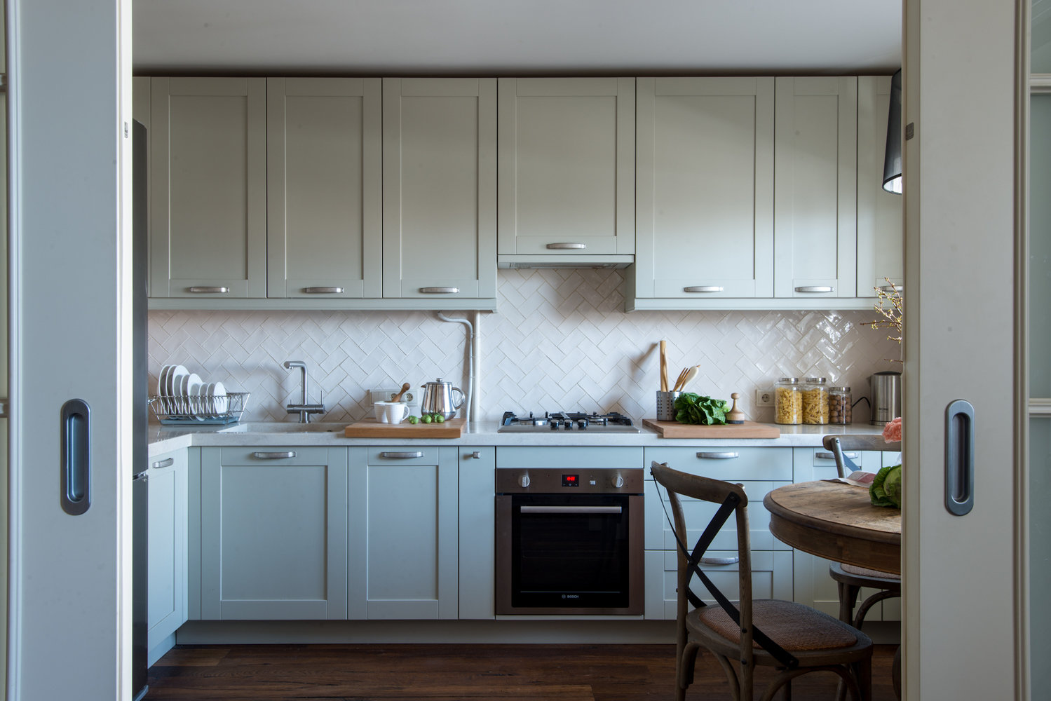 Цвета в интерьере теплые и сложные: дизайнер использовала разные оттенки зеленого, бежевого, коричневого.