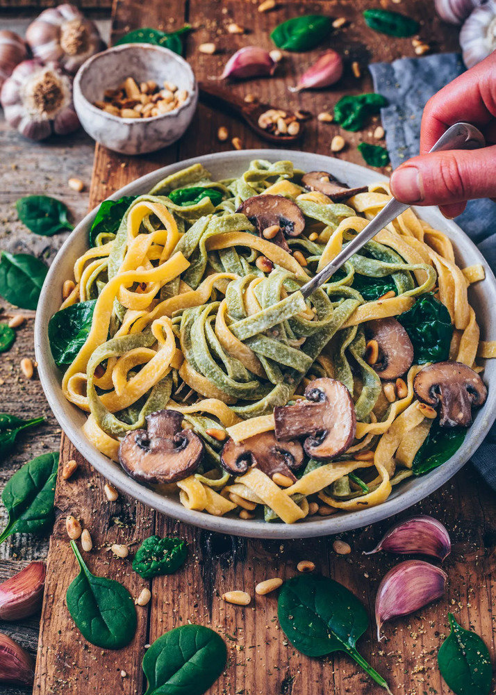Фотография:  в стиле , Обед, Основное блюдо, Вегетарианская, Веганская, Жарить, Паста, Итальянская кухня, Кулинарные рецепты, Варить, Грибы, 30 минут, Просто, Шпинат, Макароны – фото на INMYROOM