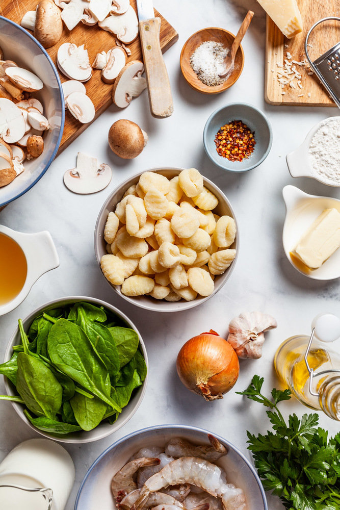 Фотография:  в стиле , Основное блюдо, Тушение, Жарить, Картофель, Итальянская кухня, Кулинарные рецепты, 1 час, Европейская кухня, Средняя сложность, Шампиньоны, Креветки – фото на INMYROOM