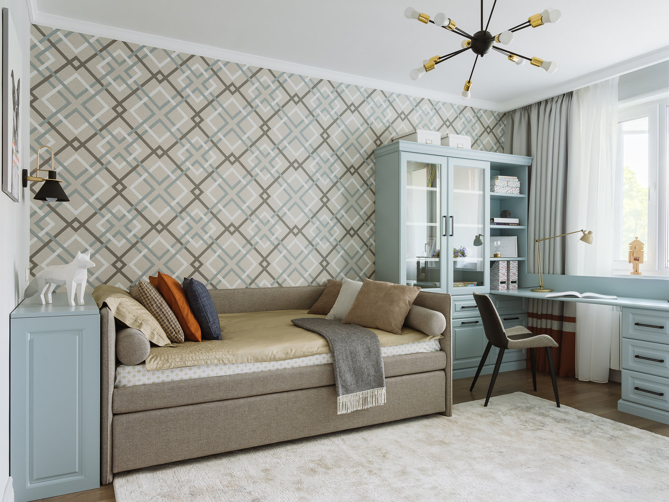 В детской комнате сочетали нежные серо-голубые и песочные оттенки. Получилось уютно.