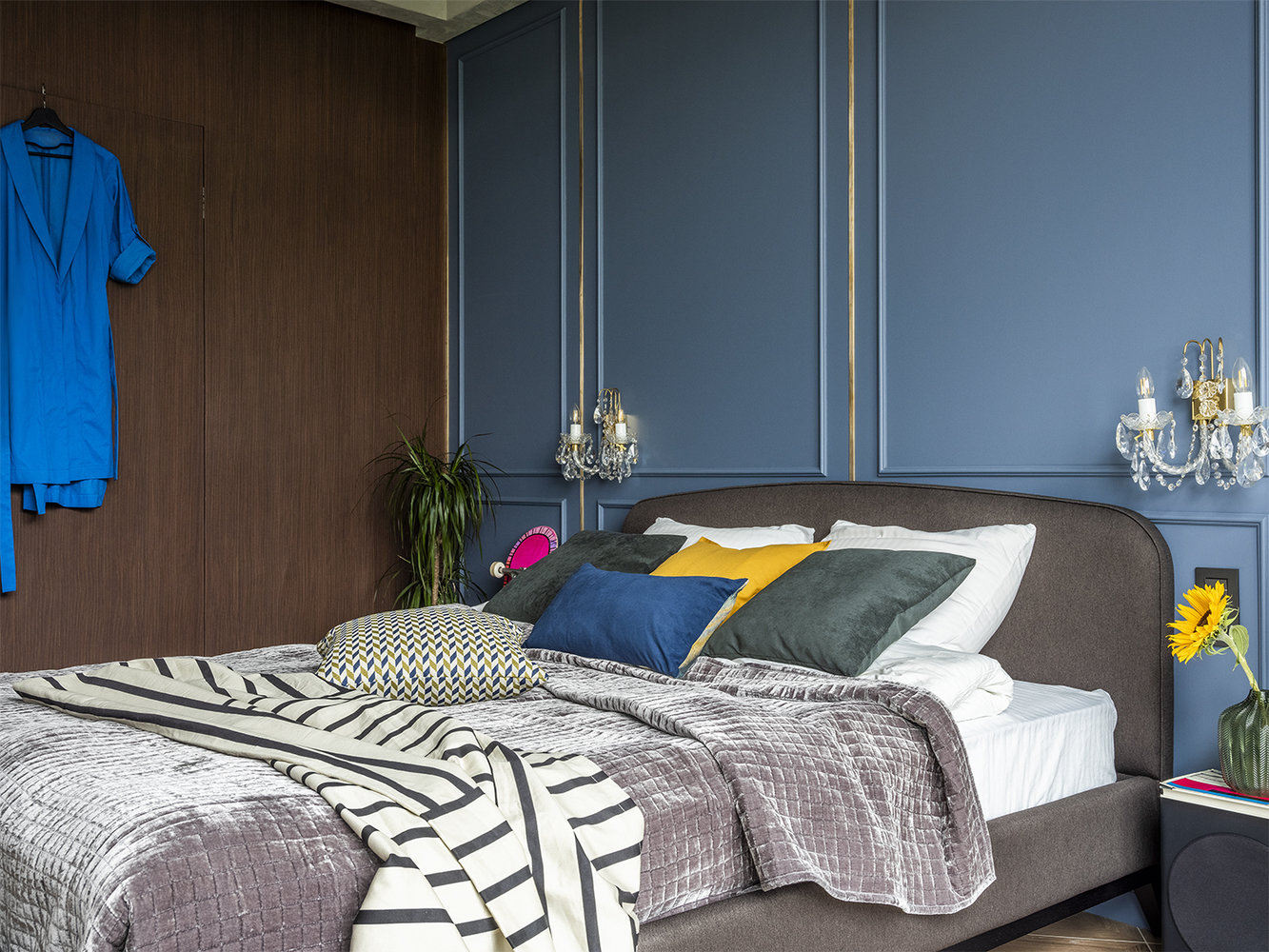 Основной источник освещения — люстры и бра, в дополнение к ним идут накладные и встроенные светильники черного цвета.