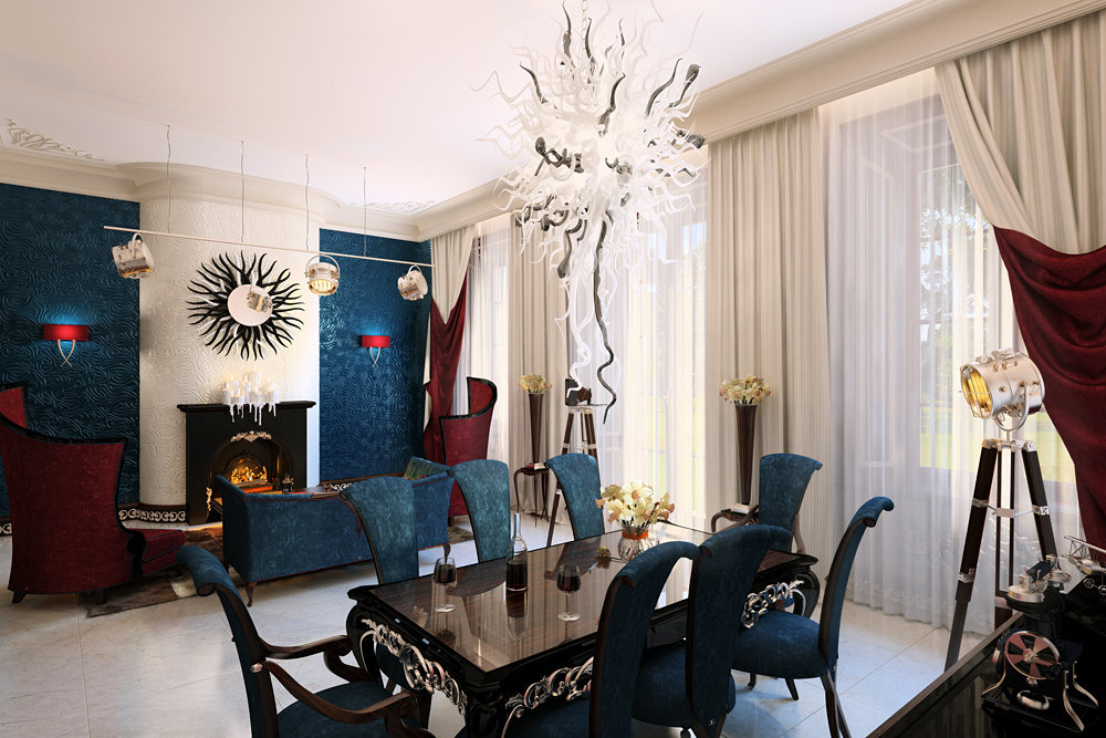 Необыный интерьер гостиной в красно-синих тонах.Гамма