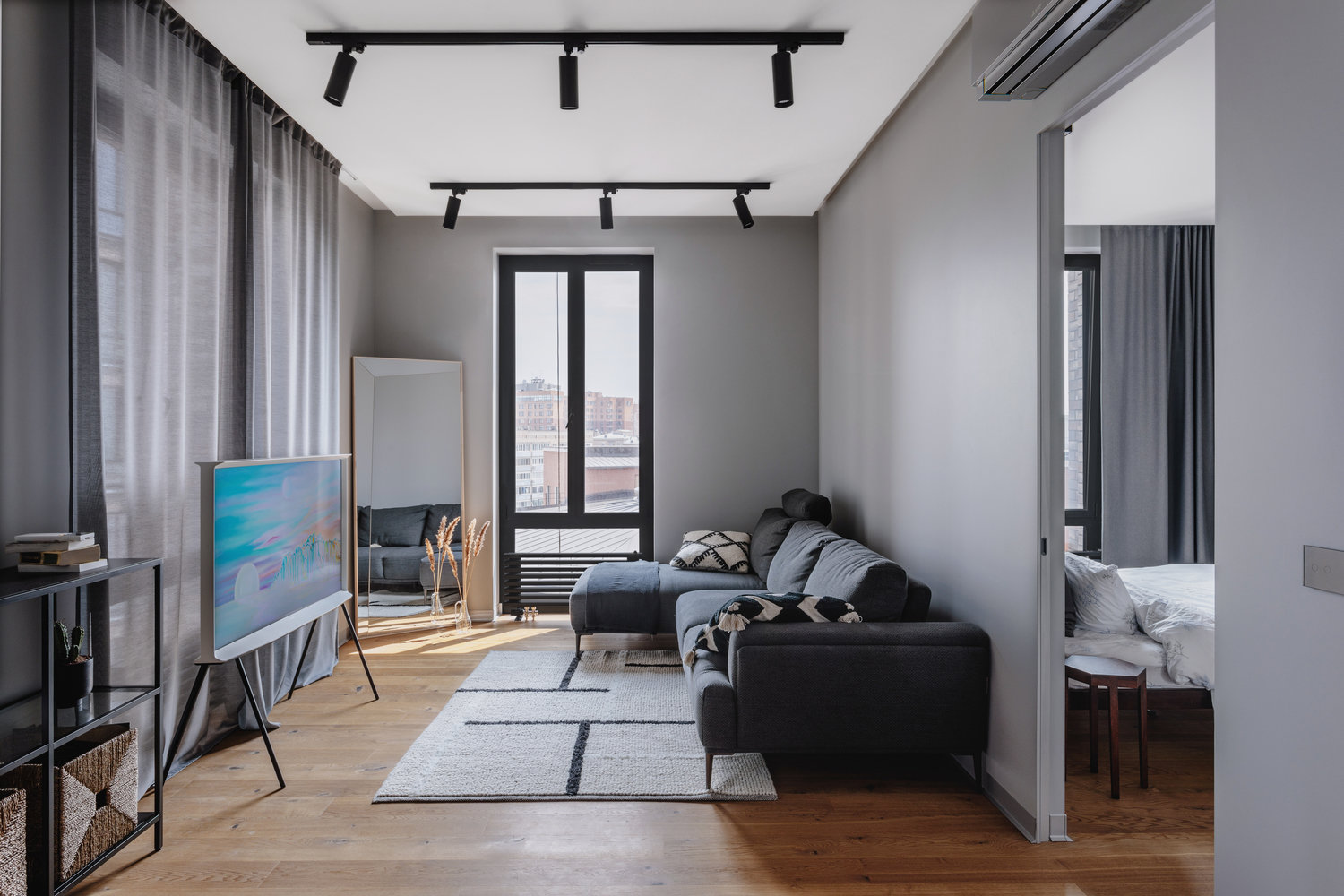 Фотография: Гостиная в стиле Современный, Минимализм, Квартира, Проект недели, Москва, Samsung, 2 комнаты, 40-60 метров, интерьерный телевизор, the serif – фото на INMYROOM
