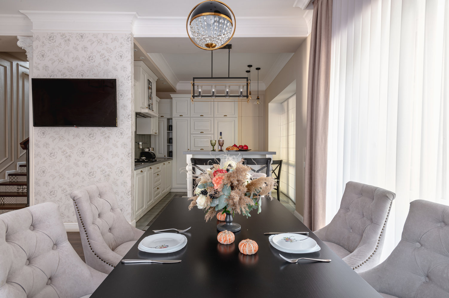Уютная кухня-гостиная с белым гарнитуром и островом, на которой готовить — сплошное удовольствиеДизайн