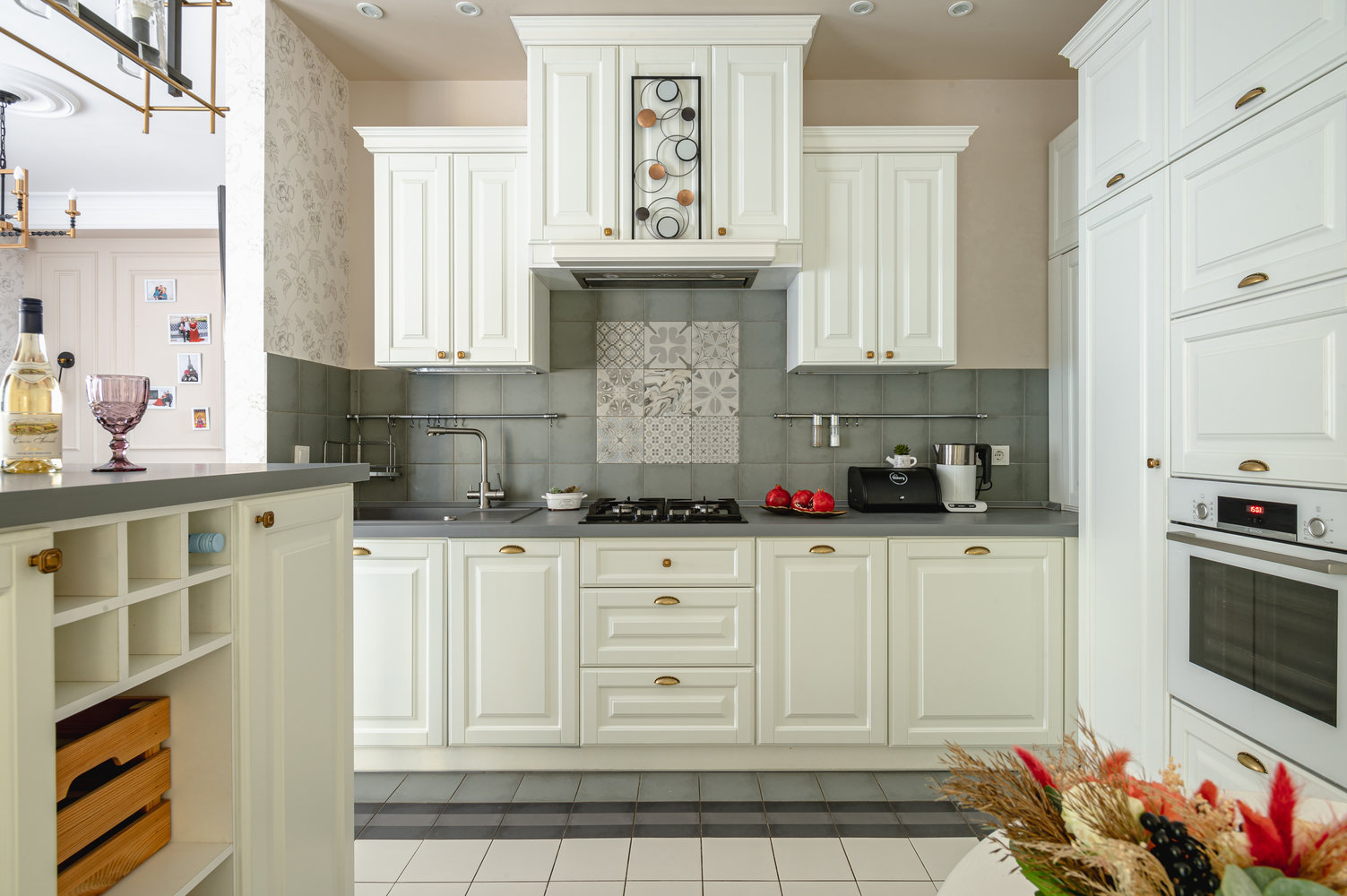 Уютная кухня-гостиная с белым гарнитуром и островом, на которой готовить — сплошное удовольствиеДизайн