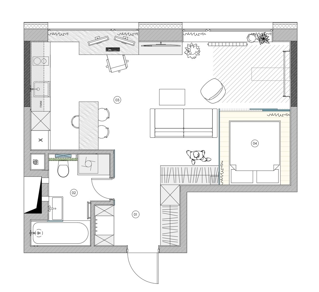 Атмосферная студия для холостяка с бетонной стеной, стеклянными перегородками и тренажерной зонойДизайн