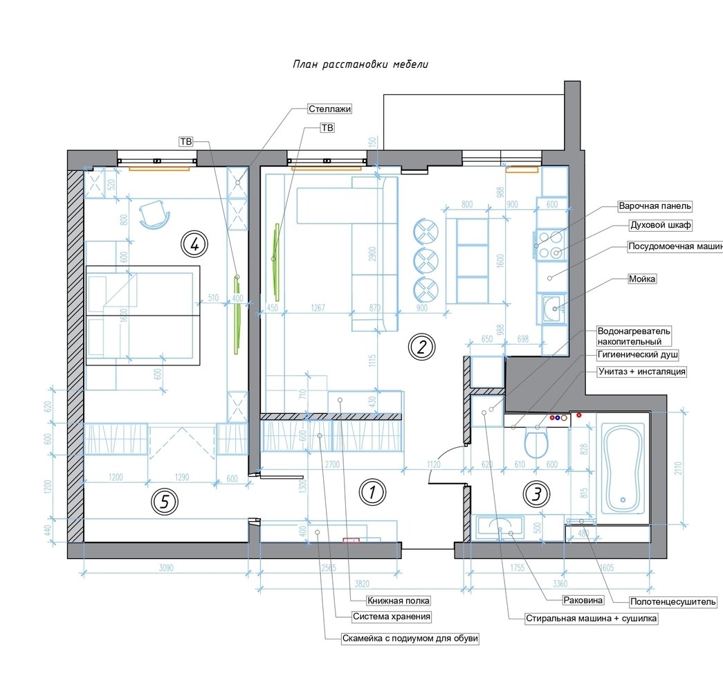 Двушка со встроенными шкафами и гардеробной за стекломДизайн
