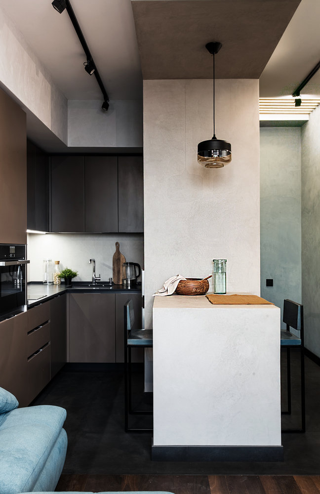 Двушка 37 м² с крохотной кухней и цементными стенамиДизайн