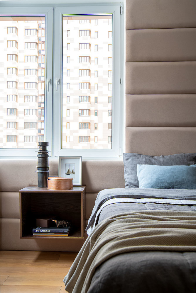 Прикроватная тумба как будто парит над полом, так как ее закрепили на широком изголовье кровати.