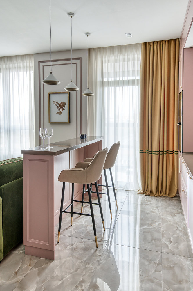 Над барной стойкой разместили три светильника с золотым декором, перекликающимся с ножками барных стульев.