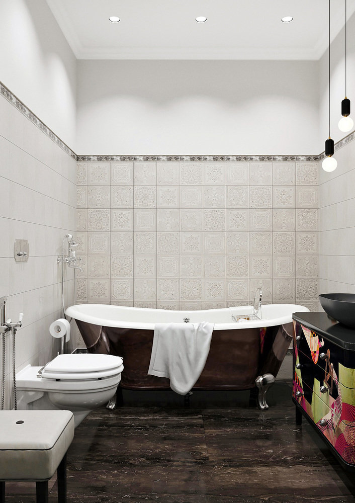Отдельно стоящая чугунная ванна будет куплена в стандартном белом цвете, а затем ее внешнюю поверхность окрасят под медь металлизированной краской. Стеклянное душевое ограждение на металлическом каркасе и полочки в душе будут изготовлены под заказ.