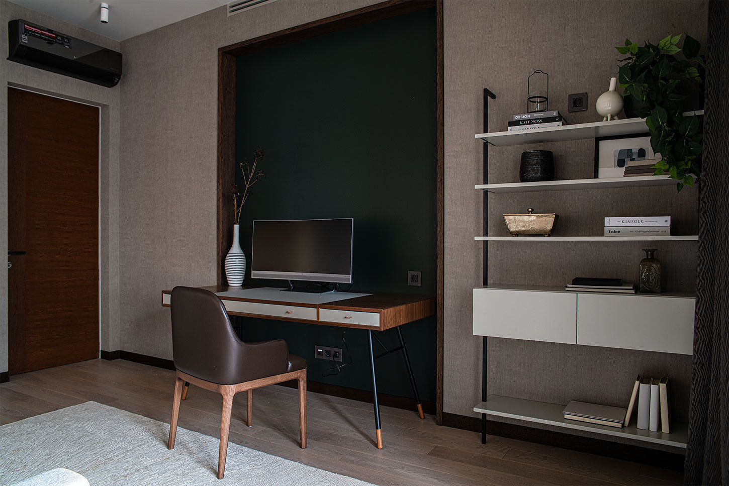 Очень простой по дизайну, но сложный по конструкции стеллаж в кабинете — полки держатся на опорах и будто «парят». Его сделали на заказ.