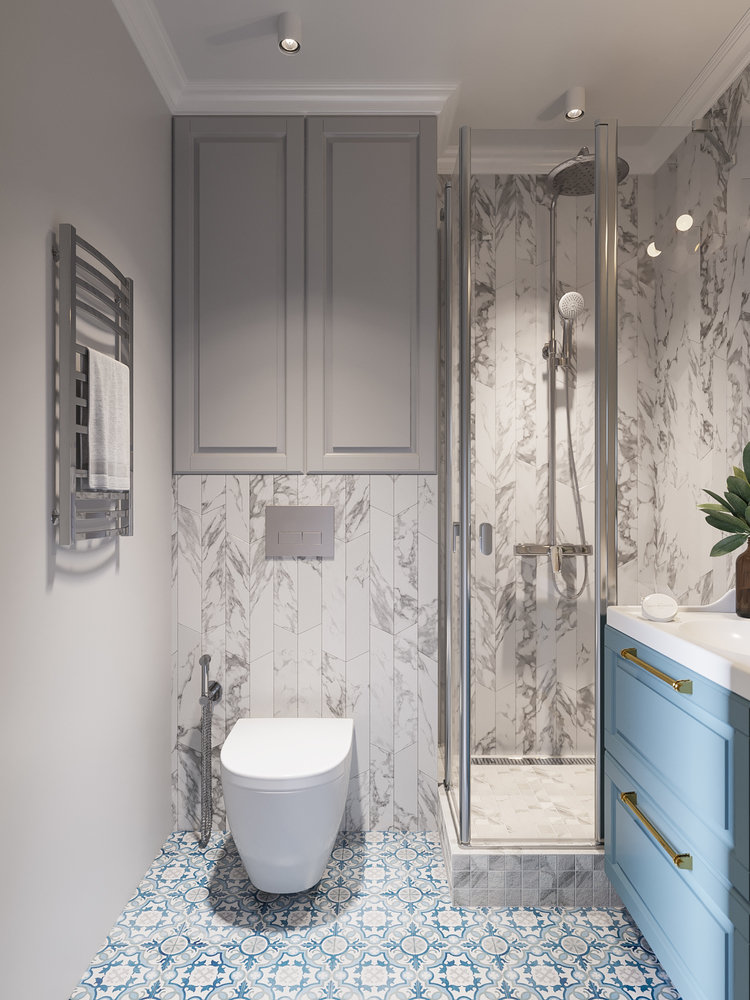 Голубую тумбу поддержали красивой плиткой с узорами голубого и синего цветов. Смотрится очень свежо и стильно.