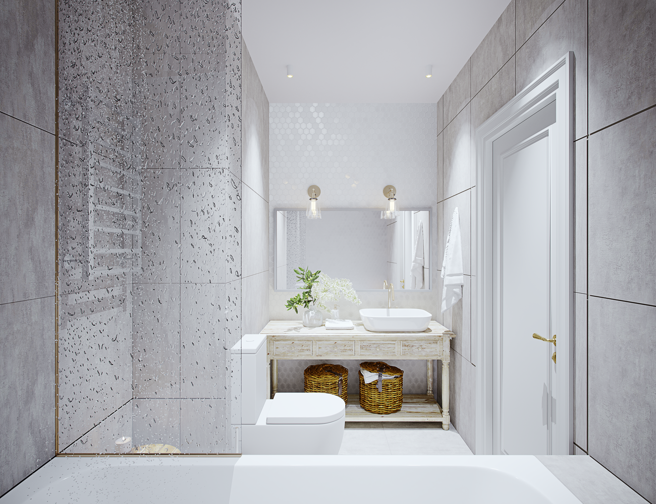 Длинная тумба под раковину в прованском стиле со специальной полкой под плетеные корзины с бельем отлично вписалась в ансамбль санузла. Зеркало над раковиной визуально добавило воздуха в помещение.