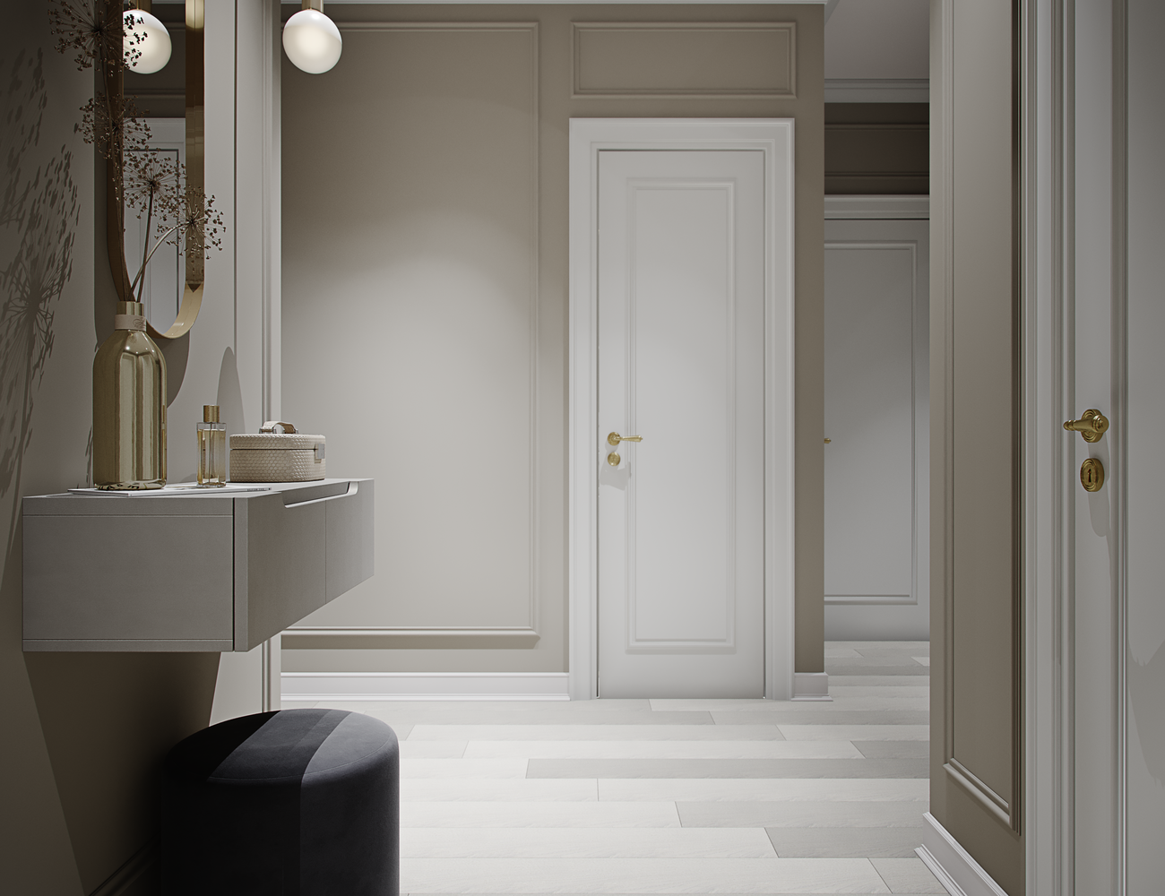 Перепланировка квартиры затронула и прихожую: в ходе увеличения гостевого санузла получилось предусмотреть нишу для неглубокого встроенного шкафа с обувными отсеками.