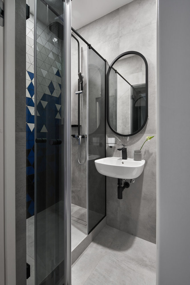 Ванная комната с душевой, использовали акцентную керамическую плитку и керамогранит.