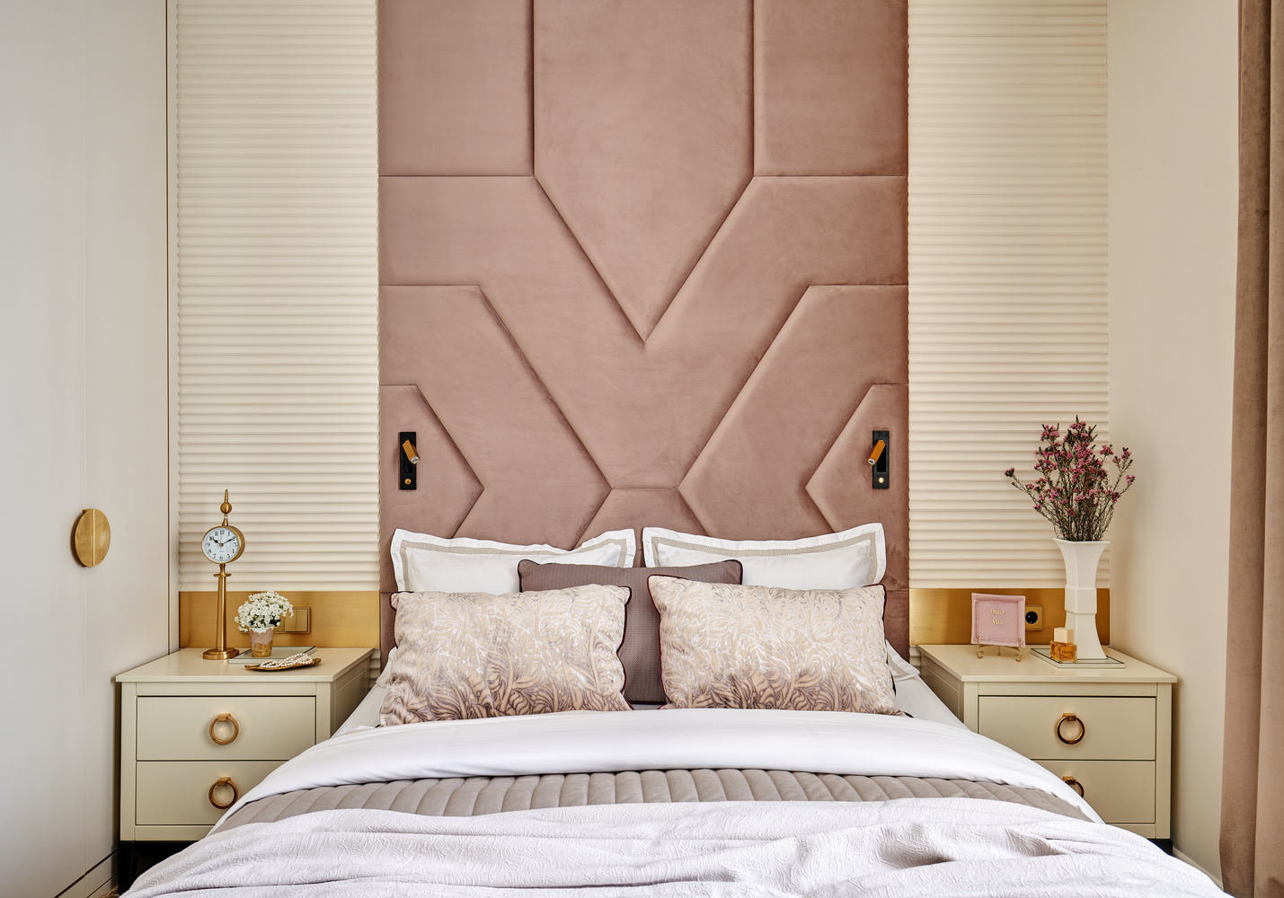 Спальни получились небольшого метража. В одной из них сделали стеновые панели до потолка, а в другой — просто низкое изголовье кровати.
