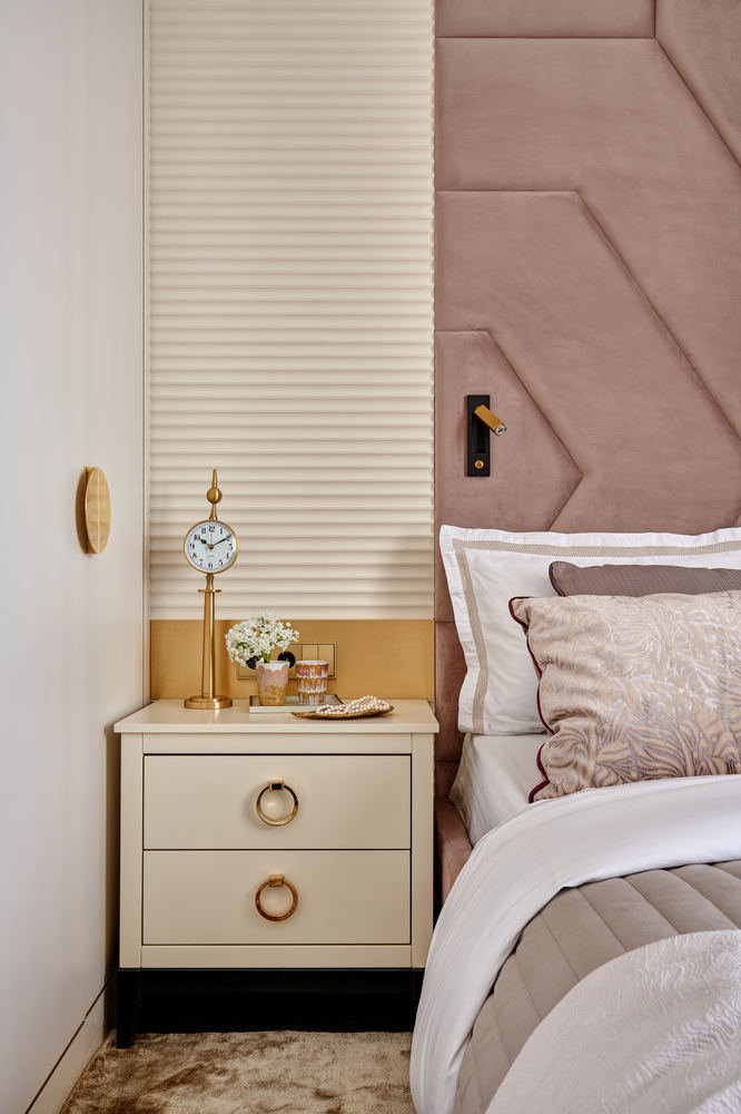 Заказчица хотела сделать невидимыми розетки и выключатели у кровати. Выбрали специальную серию выключателей из латуни, их смонтировали на латунных листах, которые специально изготовили на заводе.