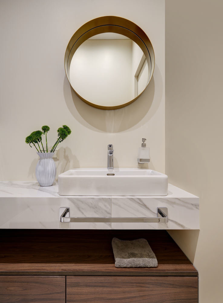 В гостевом санузле шахту скрыли за деревянными панелями, которые переходят в шкаф. В шкафу разместился бойлер и предусмотрен удобный доступ к коммуникациям.