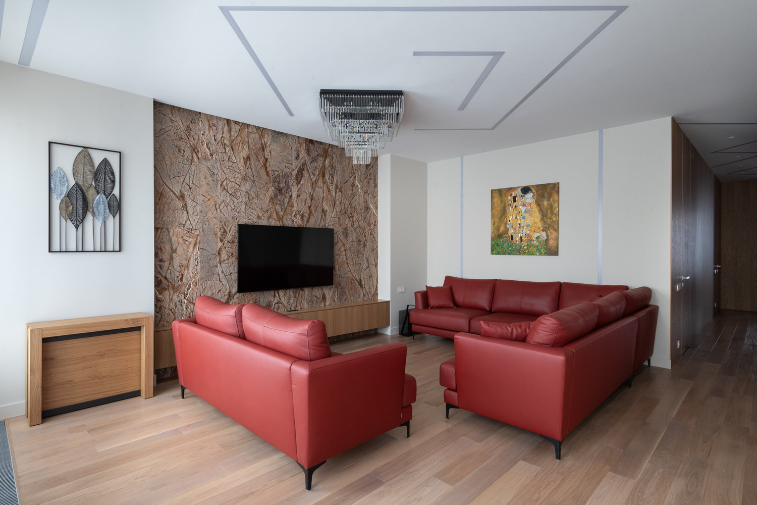 Мрамор в нише стал акцентным элементом в гостиной — он притягивает взгляд, сочетается с цветом дивана, придает роскоши помещению, натуральный камень всегда будет вне времени.