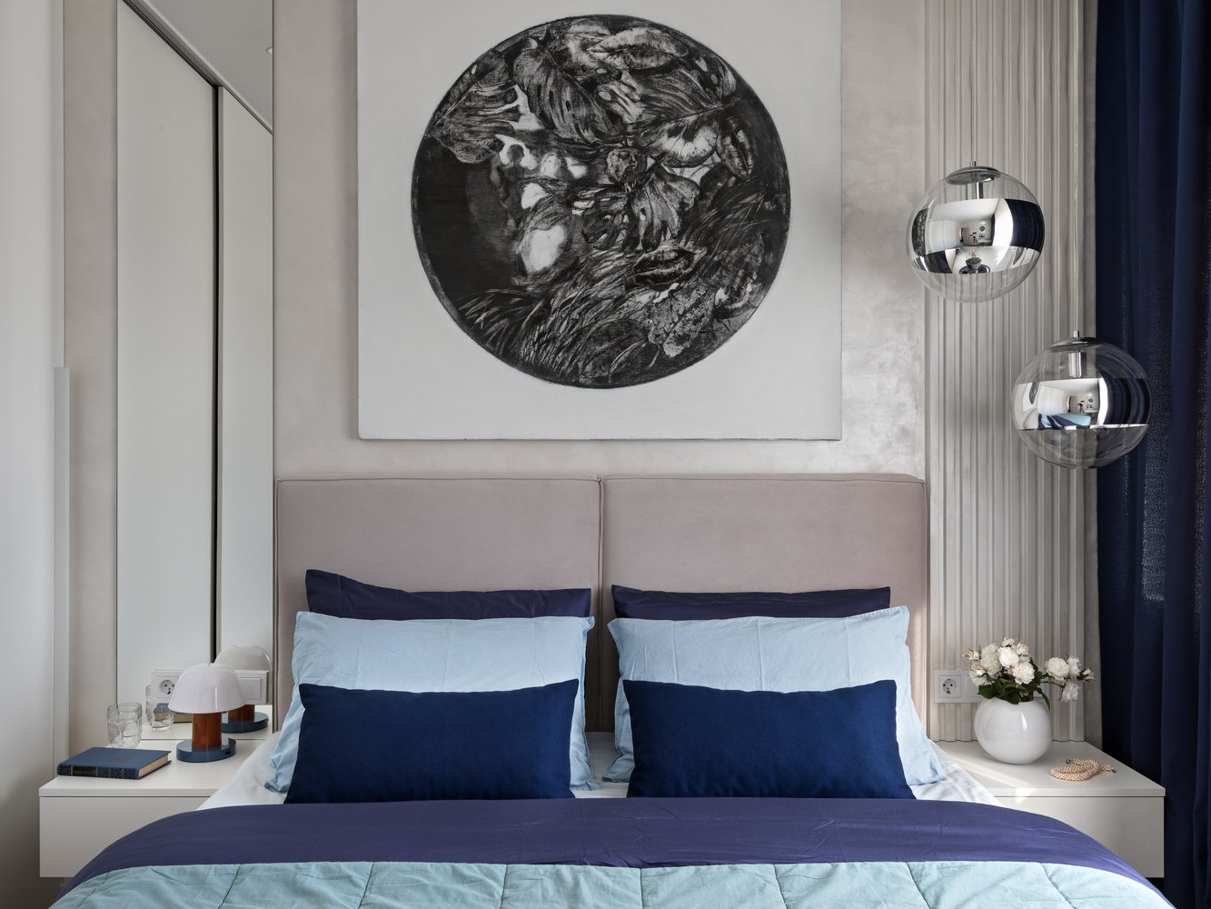 В спальне использовали декоративную штукатурку. По визуальным ощущениям она более мягкая и показывает фактуру стен.