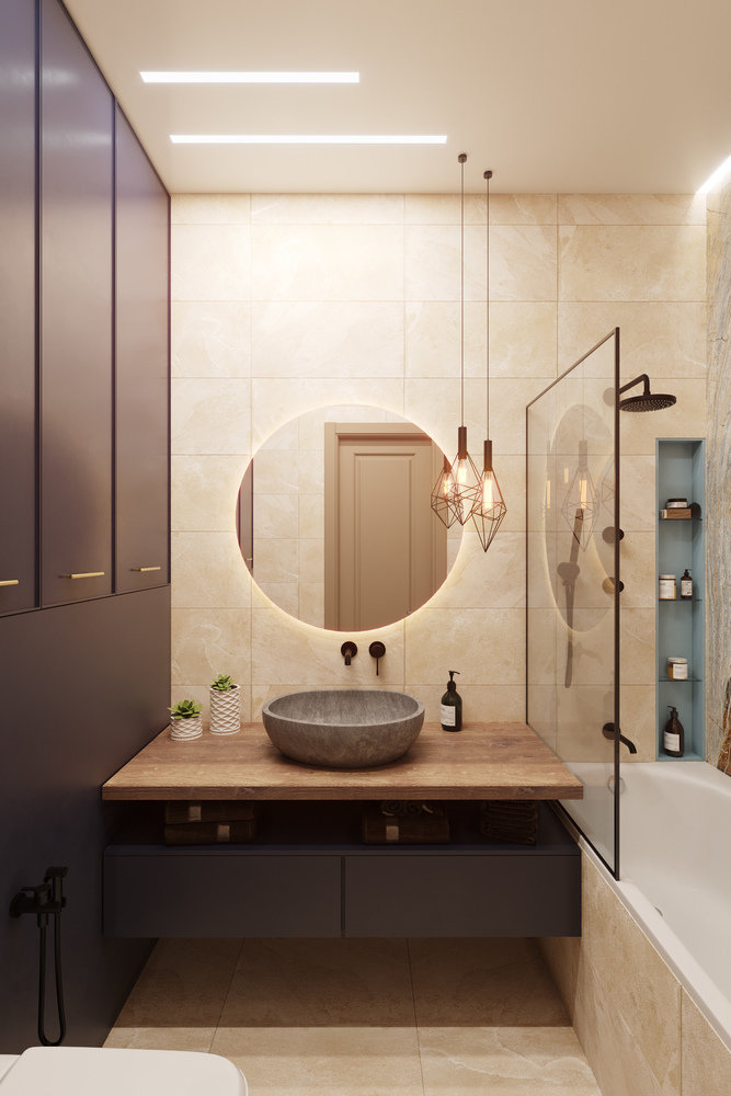 Раковина в ванной выполнена из речного камня, а столешницы изготовлены из особой породы дерева — тика, предназначенного специально для мокрых помещений.