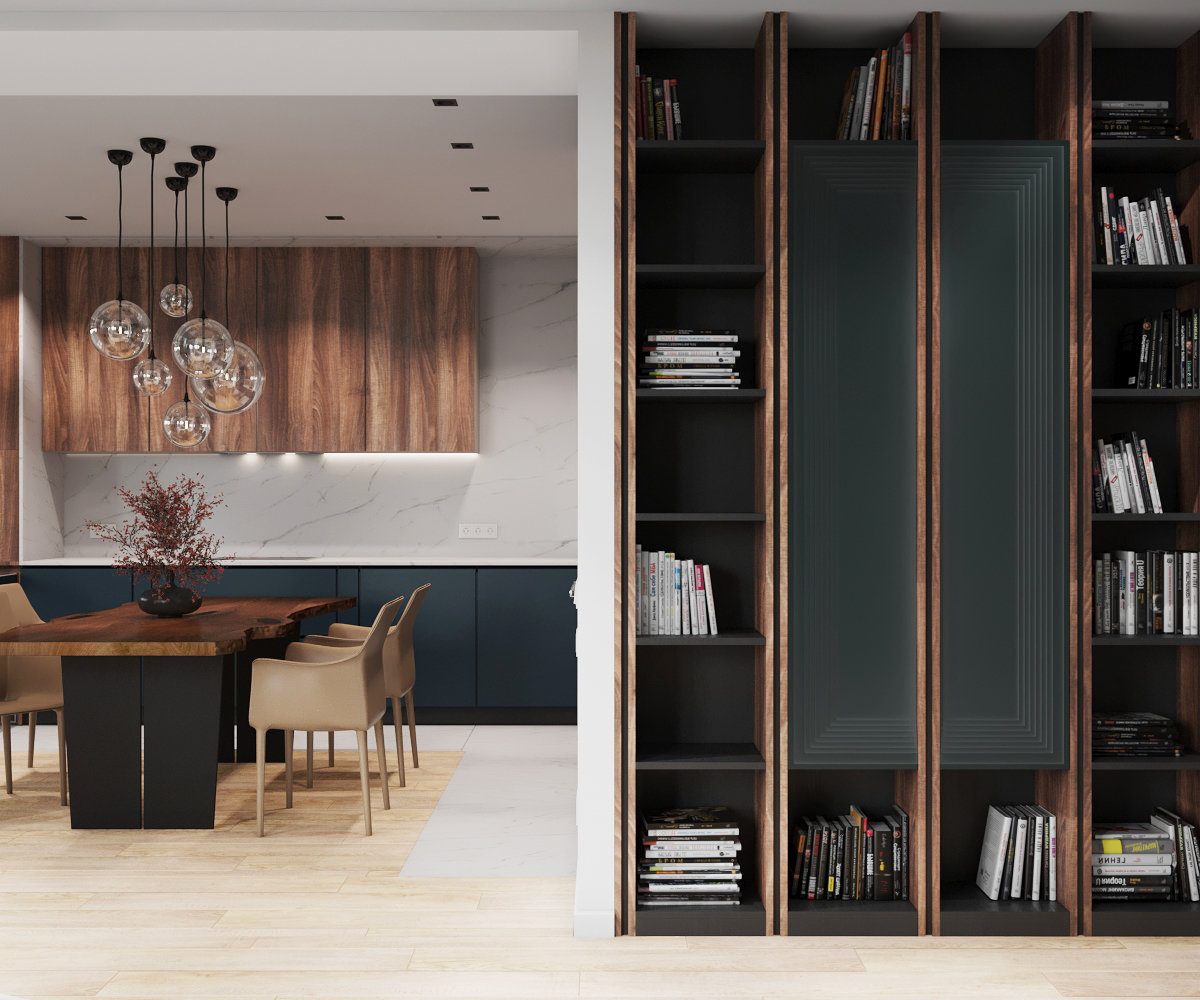 В проекте много систем хранения для книг и личных вещей. В гостиной спроектировали интересные стеллажи для этих целей.