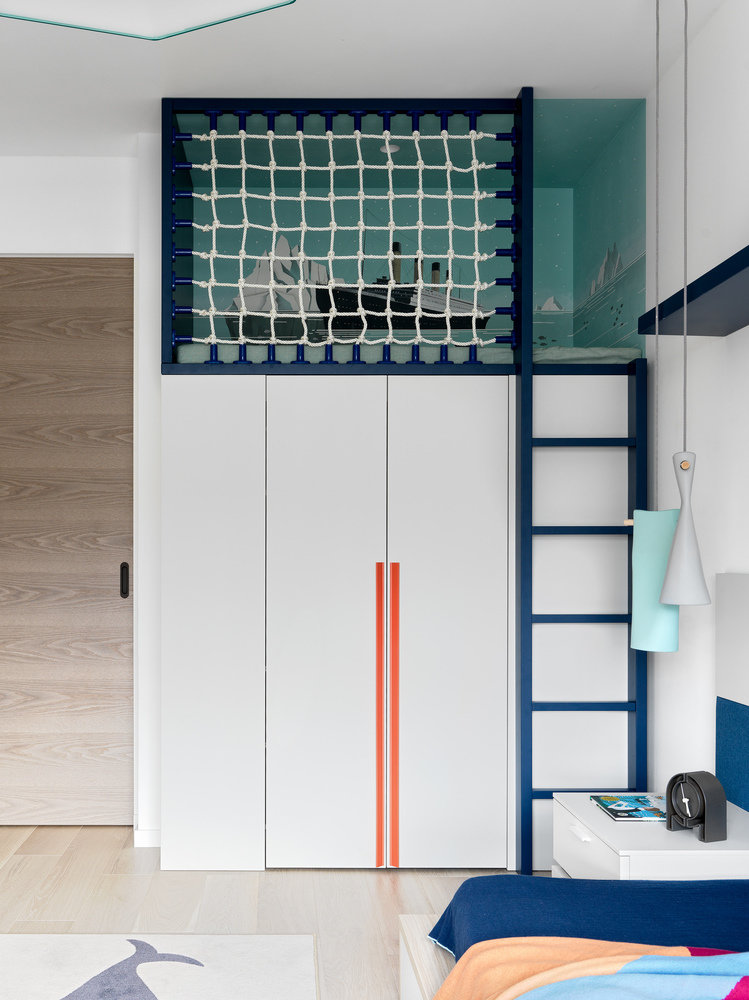 Над шкафом разместили уютную зону, где мальчик сможет уединиться, если будет такая необходимость.