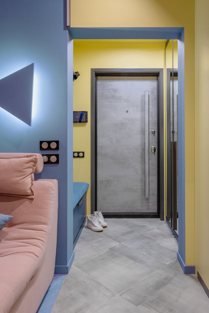 Входная зона получилась около 2,5 квадрата, но при этом она очень удобная — с банкеткой, вешалкой и зеркалом, расширяющим пространство. Фишка прихожей — желтый цвет стен, который переходит на потолок и дальше на шкафы в гостиной.