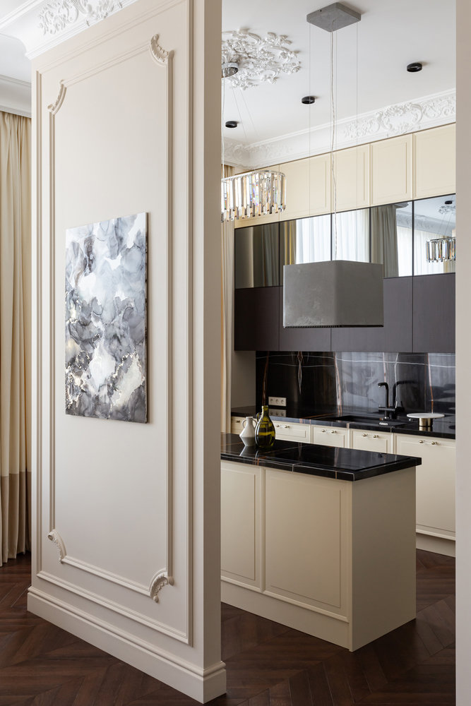 Мечта заказчицы — кухня с островом, ее отделили от гостиной стеной с проходами. Так как заказчики любят смотреть ТВ, их необходимо было разместить и со стороны кухни, и со стороны гостиной.