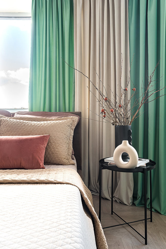 Большая часть мебели из ИКЕА. Кровать с велюровой обивкой кофейного цвета изготовили на заказ, чтобы изголовье было в один уровень с подоконником.