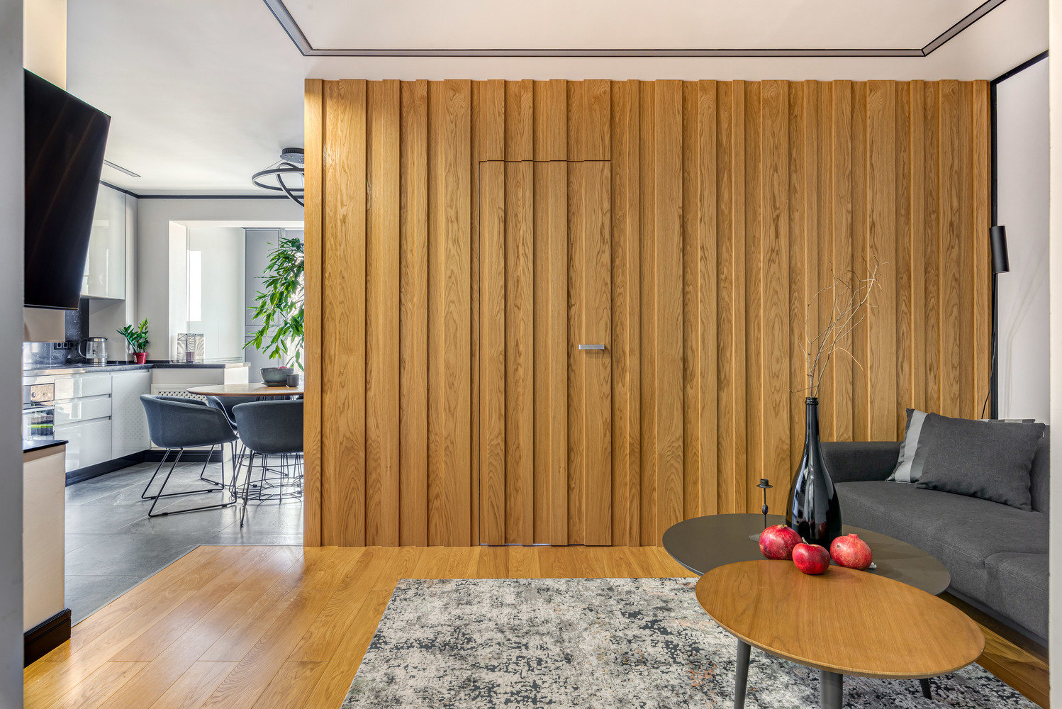 Перегородку отделали деревом и установили дверь скрытого монтажа.