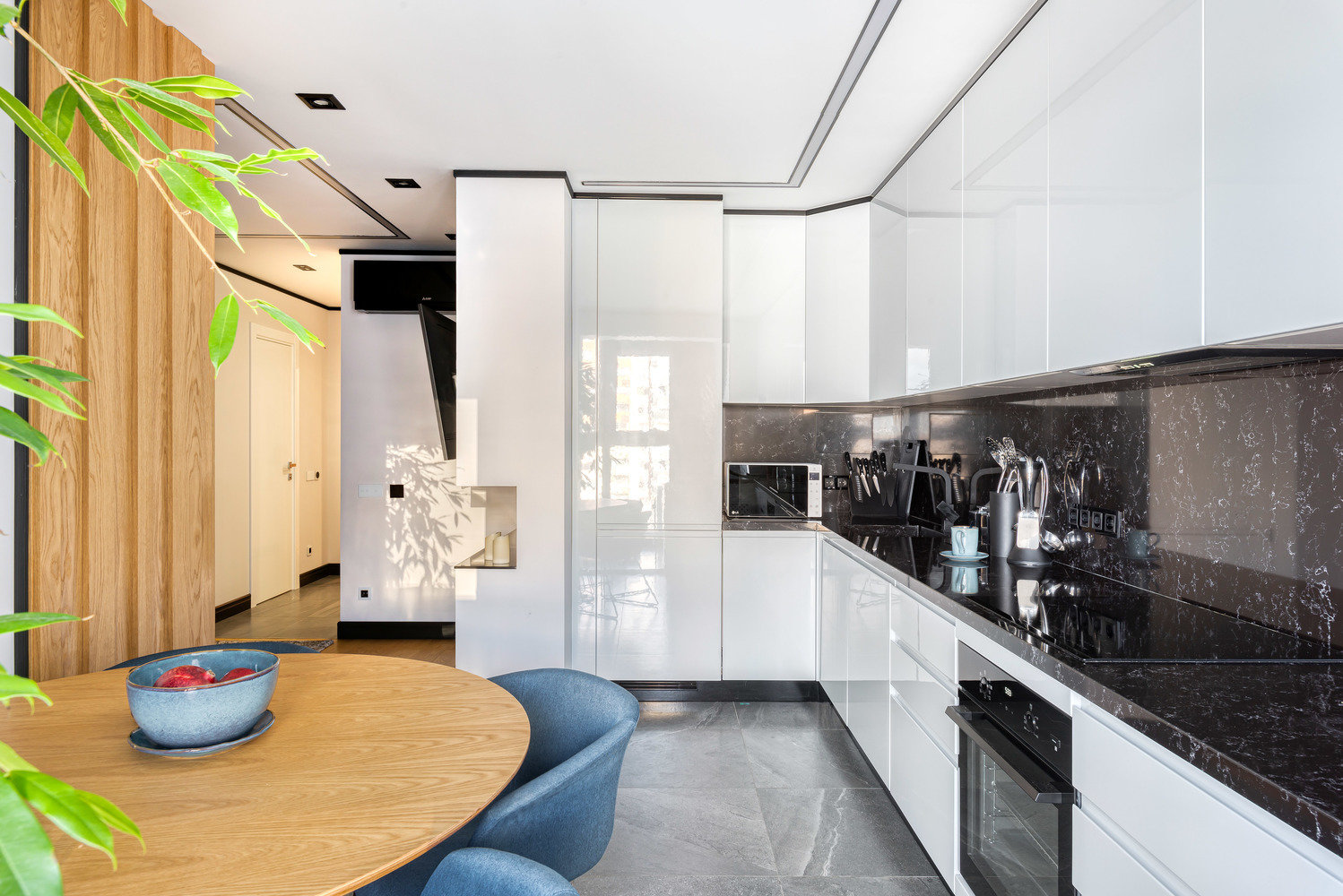 Кухонный гарнитур сделан на заказ. Холодильник встроенный, варочная панель, духовка, посудомоечная машина. Также стиральная машина, сушильный шкаф, шкаф для гладильной доски и швабр находится в зоне лоджии.