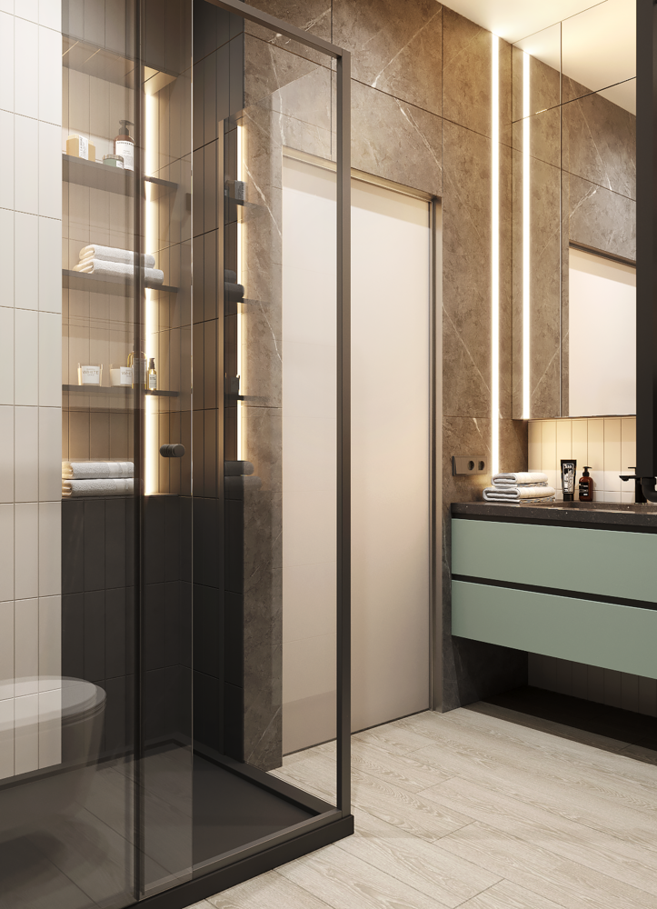 Основную ванную расширили за счет кладовой, которая была предусмотрена застройщиком в спальне.