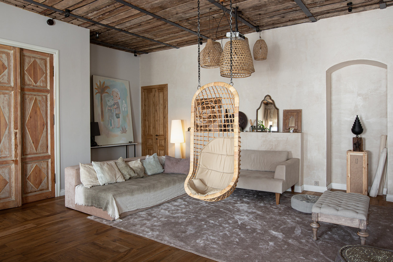 Фотография: Гостиная в стиле Скандинавский, Эклектика, Эко, Квартира, Проект недели, Санкт-Петербург, 3 комнаты, Более 90 метров, Эли Гордеева, интерьер в балийском стиле, стиль Бали, атмосфера Бали в интерьере – фото на INMYROOM