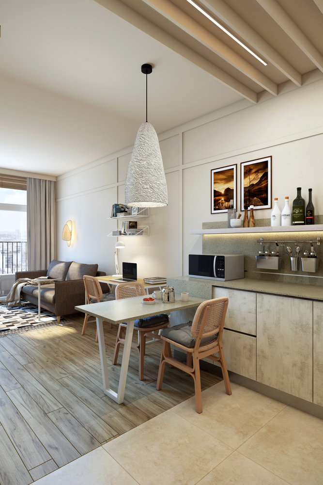 Кухня — компактная, но достаточно вместительная. Без навесных шкафов, с широкой открытой полкой для хранения продуктов. Столешница из искусственного камня переходит в обеденный стол.