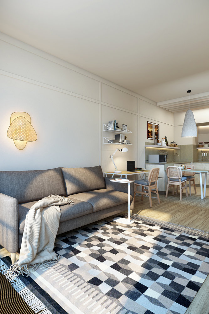 Над обеденным столом повесили аутентичный бумажный светильник ручной работы.