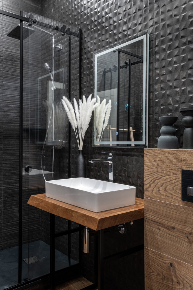 Гостевой санузел — душ со стеклянной перегородкой и плитка в урбанистической стилистике темно-графитового цвета.