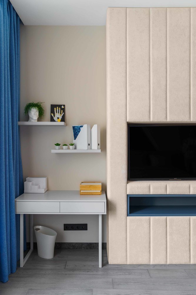 Интересная идея: утопили в нишу полки и экран телевизора, а выступ отделали мягкими панелями.
