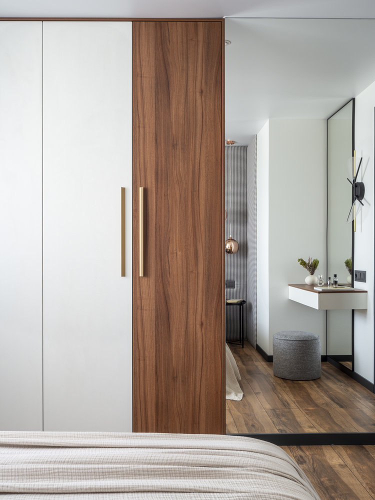 Вся корпусная мебель и стеновые панели сделаны из ЛДСП, за счет этого получилось сэкономить значительную часть средств (в сравнении со шпоном).