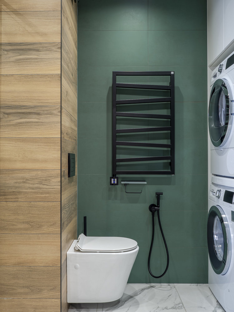 В отделке санузла использовали несколько совершенно разных коллекций керамогранита и плитки. В итоге получилось красивое сочетание глубокого зеленого цвета, геометрического принта, мрамора и дерева.