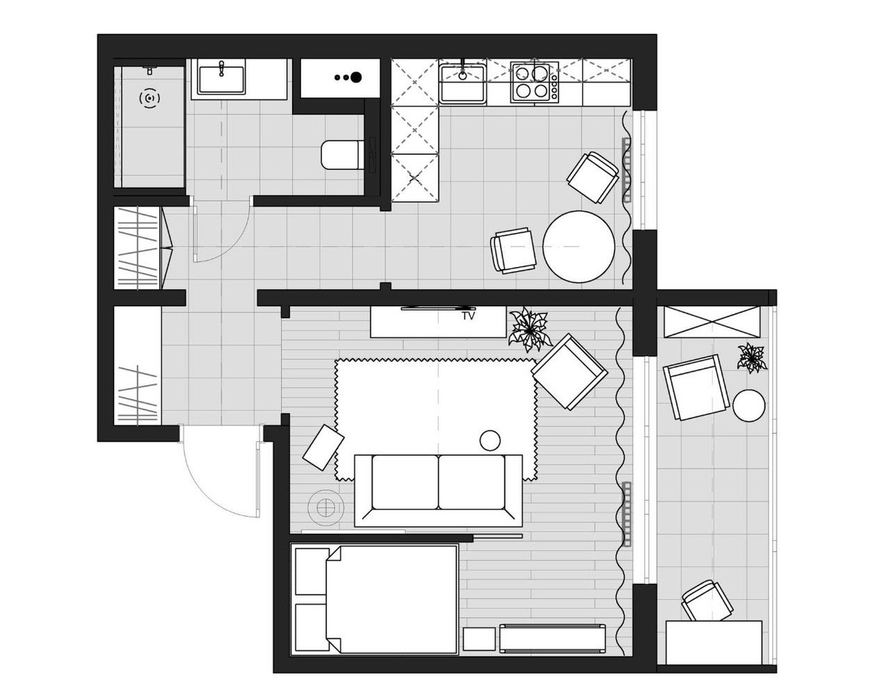 Черная кухня, отделка под бетон и металл, розовые акценты: однушка, способная поразить4,6