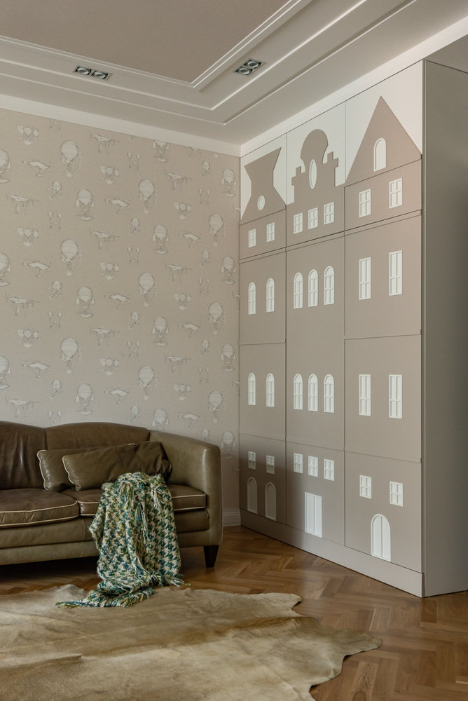 В будущей детской комнате преобладает тема путешествий по Европе. Это шкафы в виде домиков, обои с воздушными шарами.