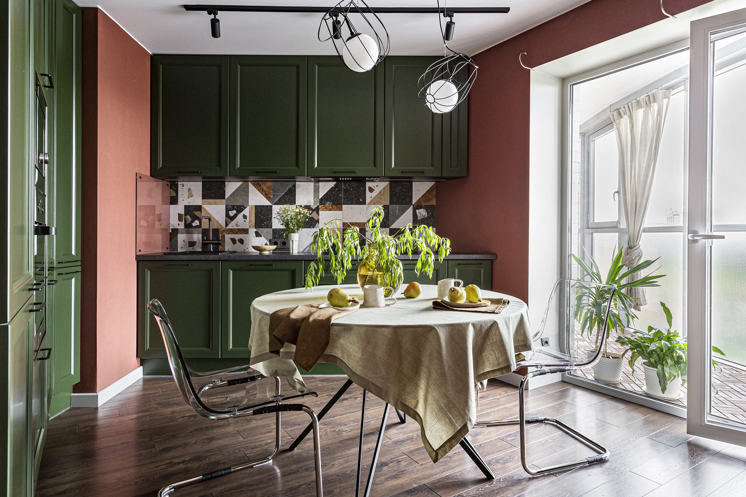 Цвета очень насыщенные: терракотовые стены, темный гарнитур сложного зеленого оттенка. Внимание обращает на себя пестрый фартук с красивой раскладкой.