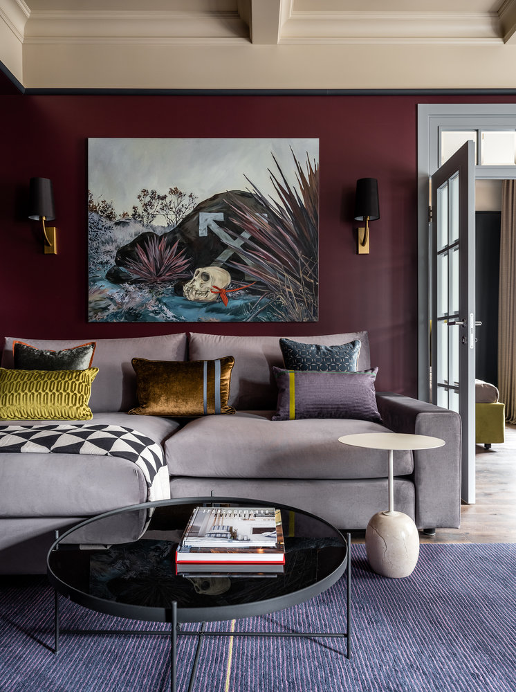 Черный молдинг проходит по периметру жилых помещений и визуально приподнимает потолок.