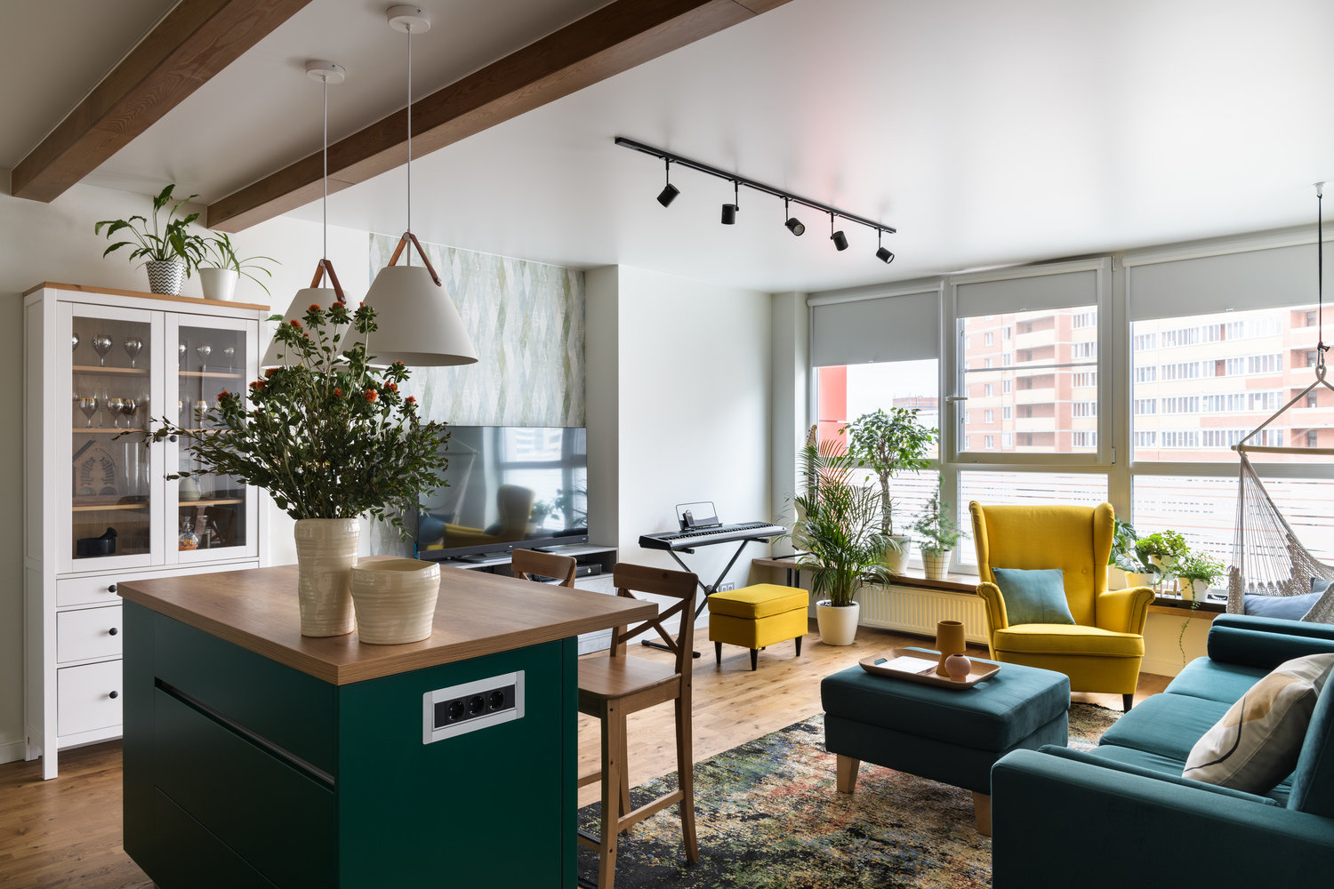 В квартире большие панорамные окна, которые решили не закрывать и впустить в дом много света. Откосы оштукатурили и выровняли, подоконники-лавочки сделали из мебельного щита и покрыли тонированным матовым лаком.