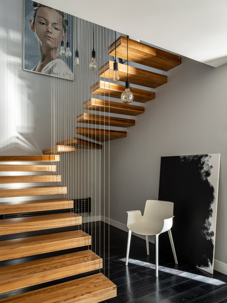 Эффектные элементы интерьера дома — лестницы. При проектировании одной из них использовали интересное конструктивное решение: кажется, что ее дубовые ступени парят в воздухе.