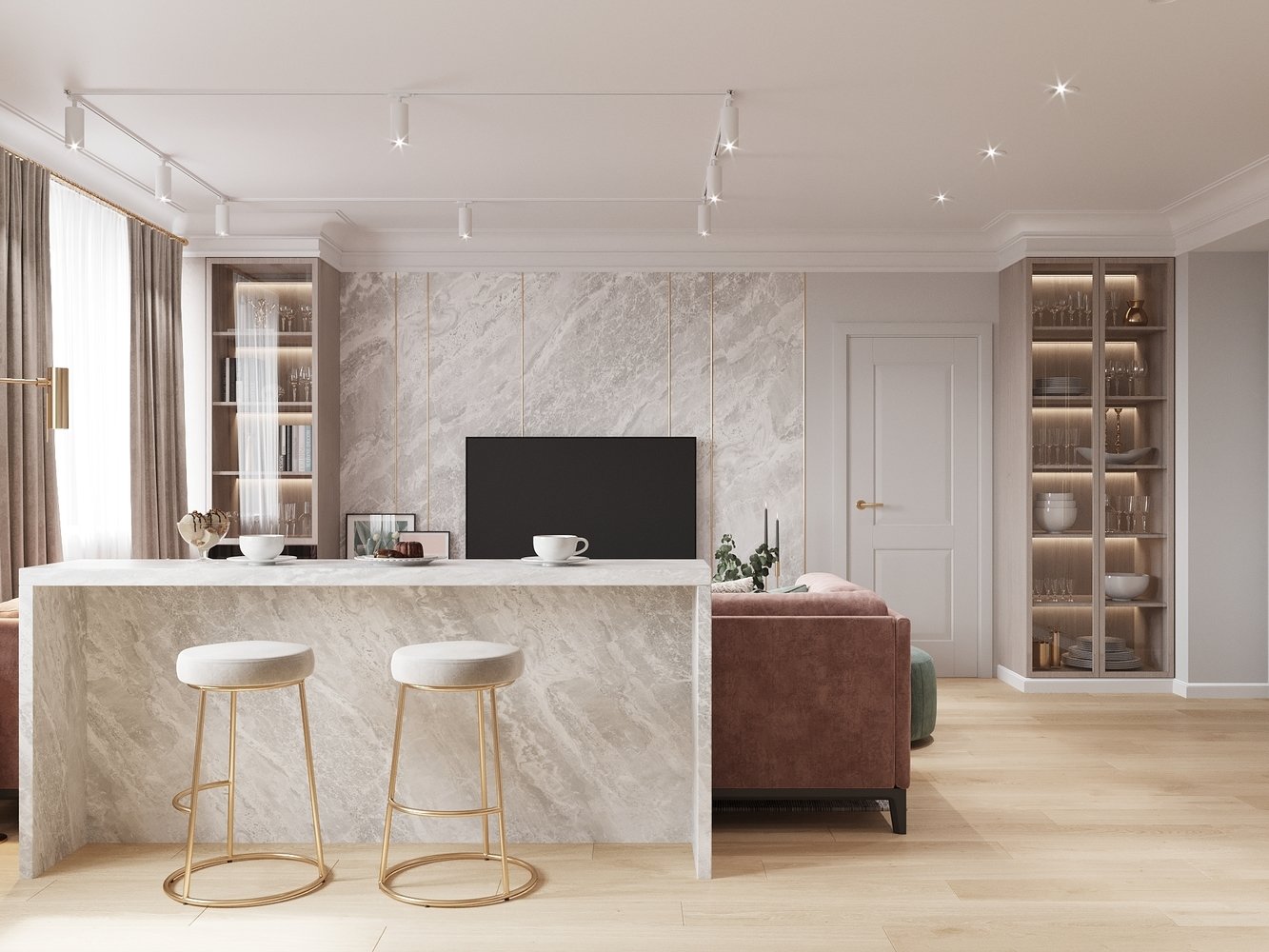 В интерьере использовали системы хранения с зеркальными фасадами и подсветкой, чтобы разместить красивую посуду и декор и создать более интересную обстановку.