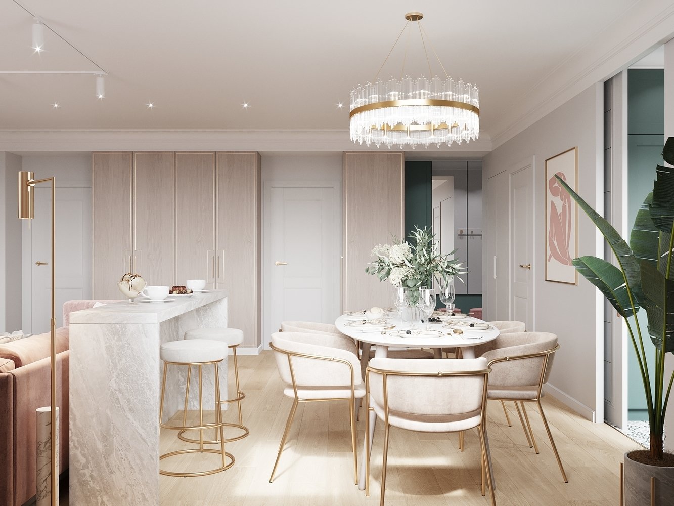 Гостиную зонировали с помощью барной стойки: с одной стороны получилась столовая, с другой — диванная зона с телевизором.